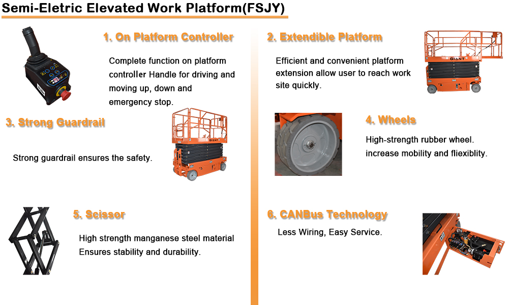 Ang Giant Lift na self-propelled scissor lift ay maaaring gumana nang hindi nalilimitahan ng mga kondisyon ng kalsada.